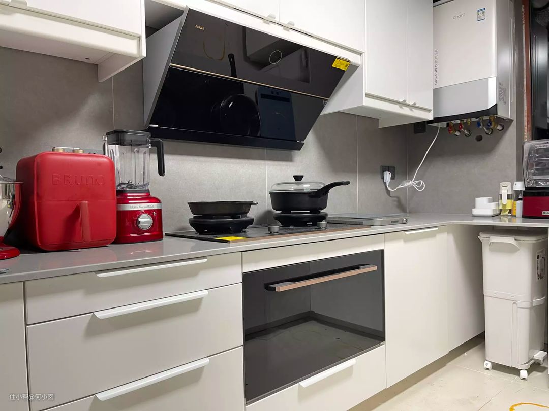 可能有人会说,那你买集成灶不也一样吗,集成灶是下排烟的,烟雾向下走,不能顺势吸烟,排烟效果不如传统的油烟机,关键集成灶只适合安装在窗口或者紧贴烟道的位置,否则烟道就会占用底柜空间,浪费底柜,正好我家没这样的位置,所以,就还是选了集成烹饪中心了