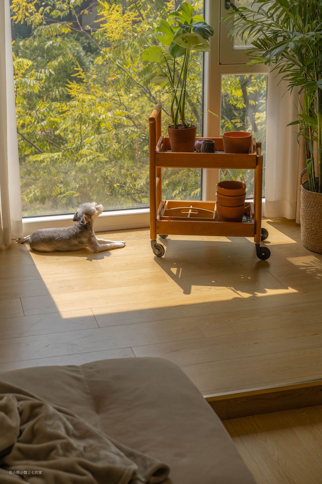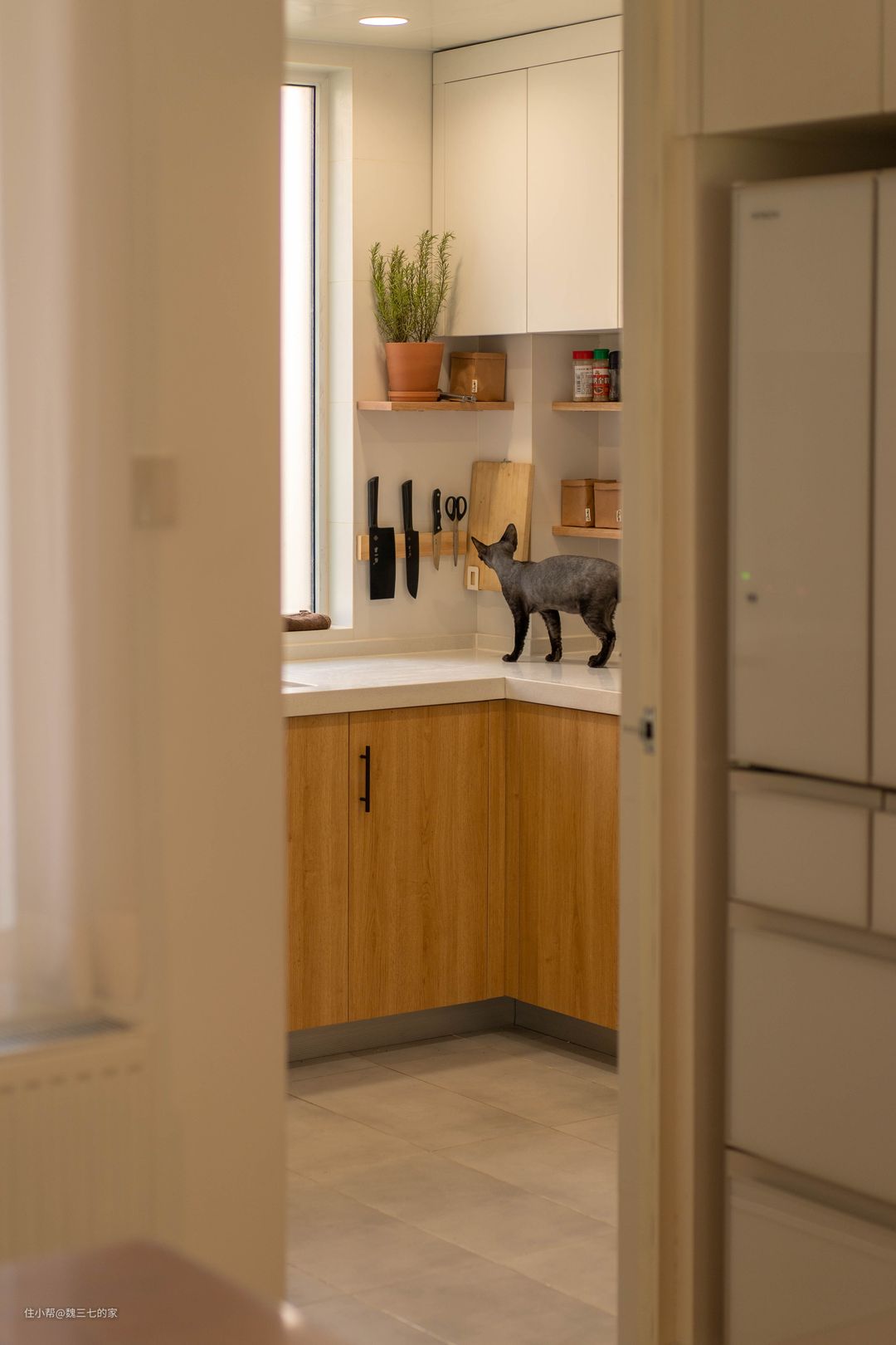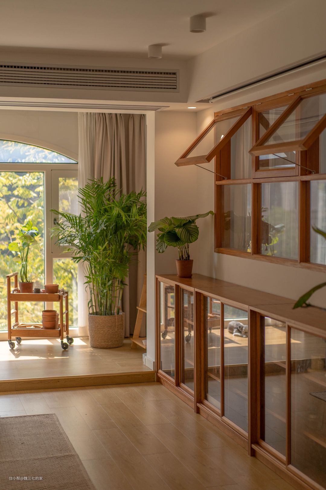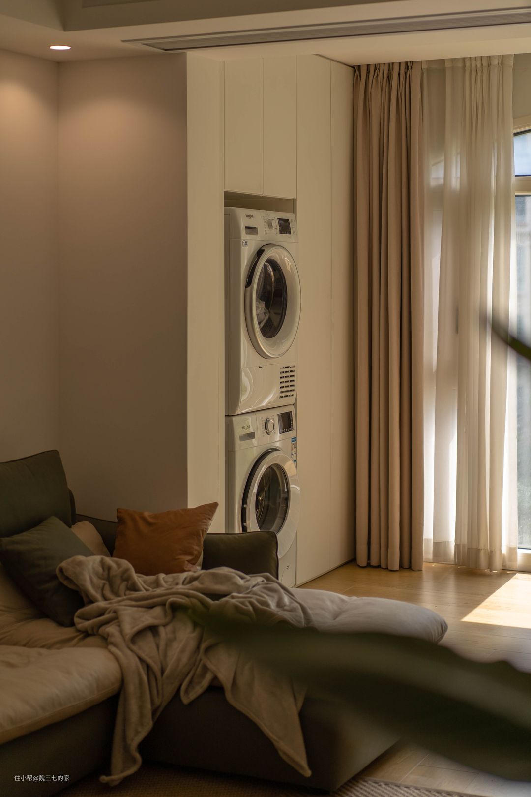 我家轻硬装,重软装,没有一点多余的吊顶和背景墙,全屋乳胶漆大白墙,白色柜门一门到顶,事实证明,大白墙审美不会疲劳,被猫狗弄脏了,也最好修补,不会有色差。