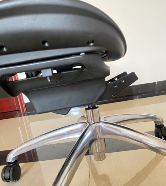 它的底盘是Smart重力感应底盘,坐上去可以根据我的体重来调节后背,我的体重相对来说比较轻,就算是往后靠也是轻而易举。我同事体重比我重一些,它也可以根据我同事的体重来调节后背,使我同事起来的时候不费任何力气。
