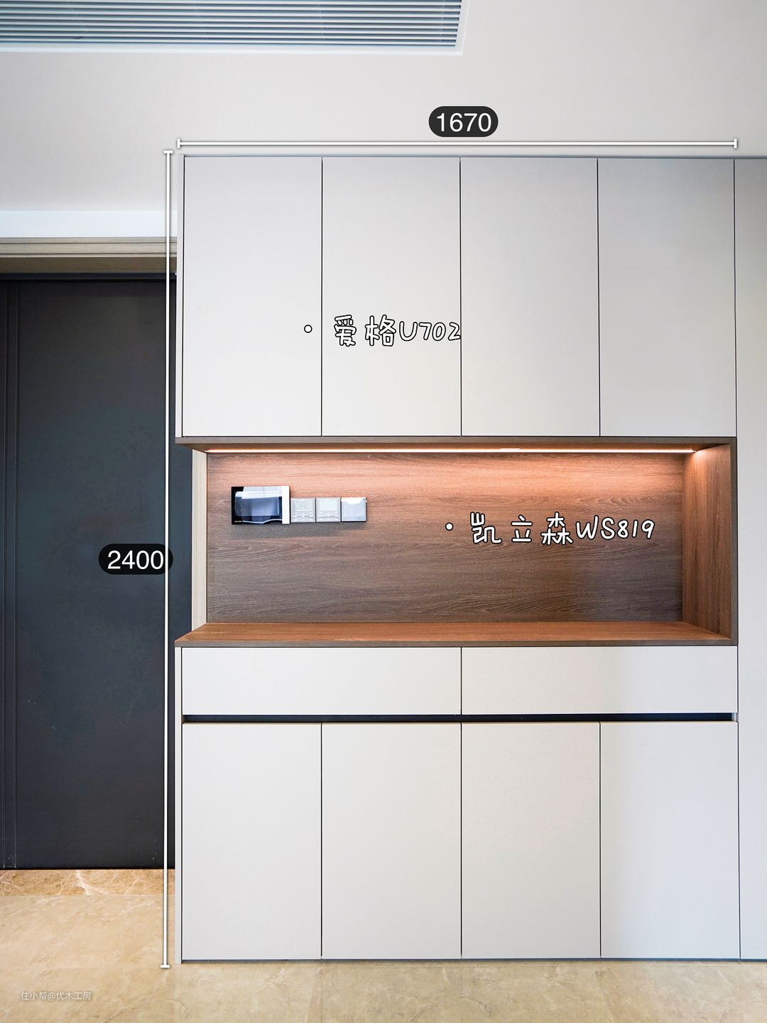 ?开放柜2040*582超大尺寸,进门随手置物超方便;内嵌感应灯带,温馨的同时又能晚上照亮。