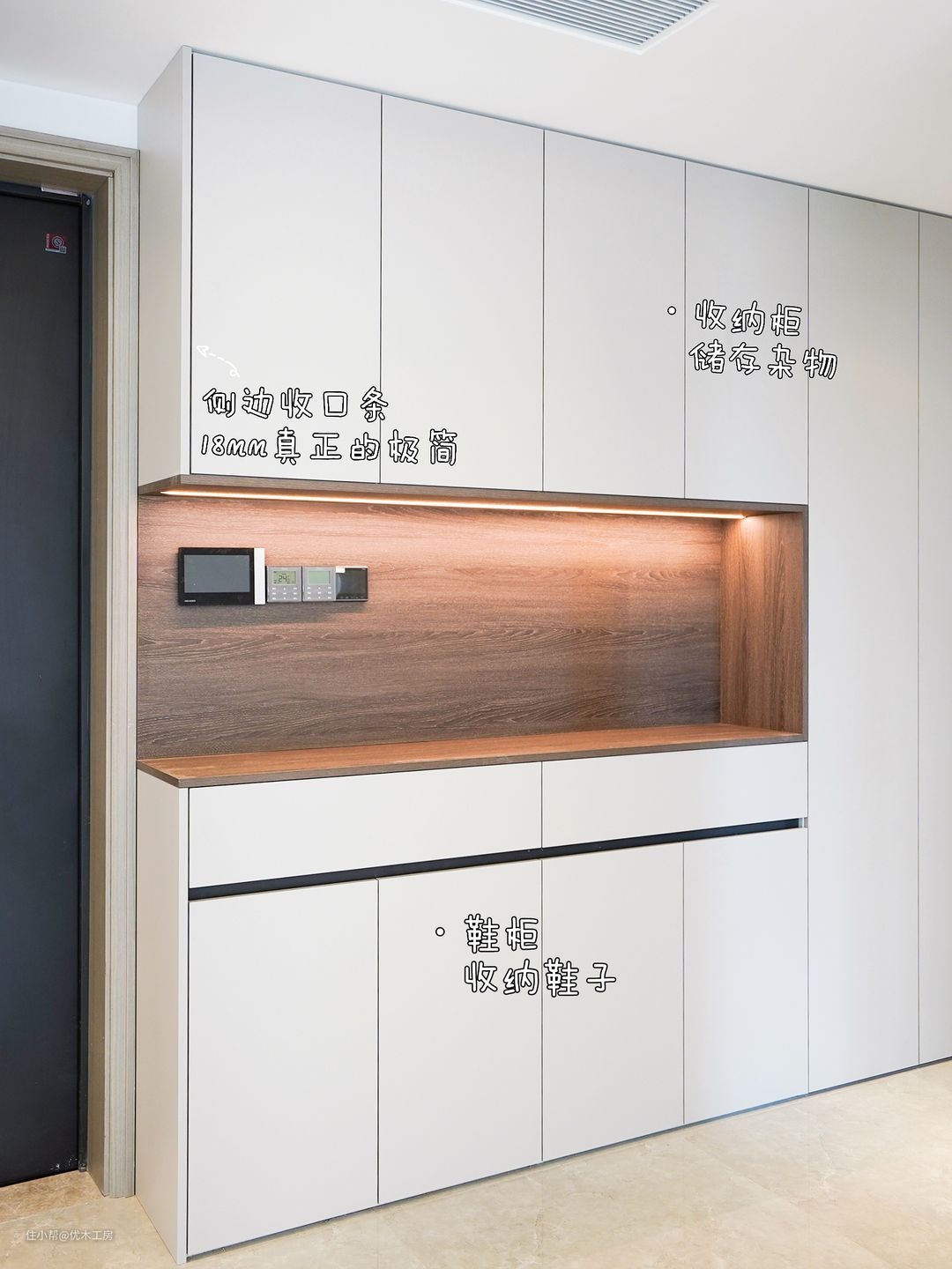 ?利用狭长走廊做收纳柜,把家中电表、变压器等巧妙隐藏起来,增加杂物收纳以及鞋柜空间。