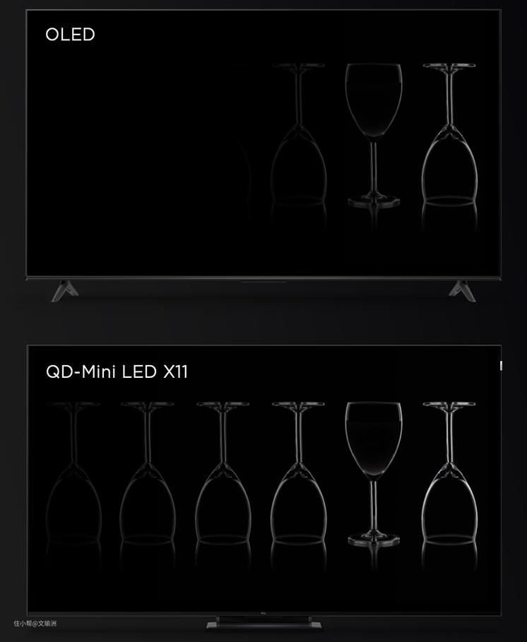 OLED自发光的特点即使有点也是缺点,其中最大缺点就是亮度很难提高,基本在500-800nit上下。所以在暗部场景的细节显示上,QD-Mini LED可以清晰显示出六只酒杯的轮廓;而OLED屏幕却仅能显示3只酒杯,虽然OLED可以黑的彻底,但是因为亮度的原因现在看来也是无济于事了。