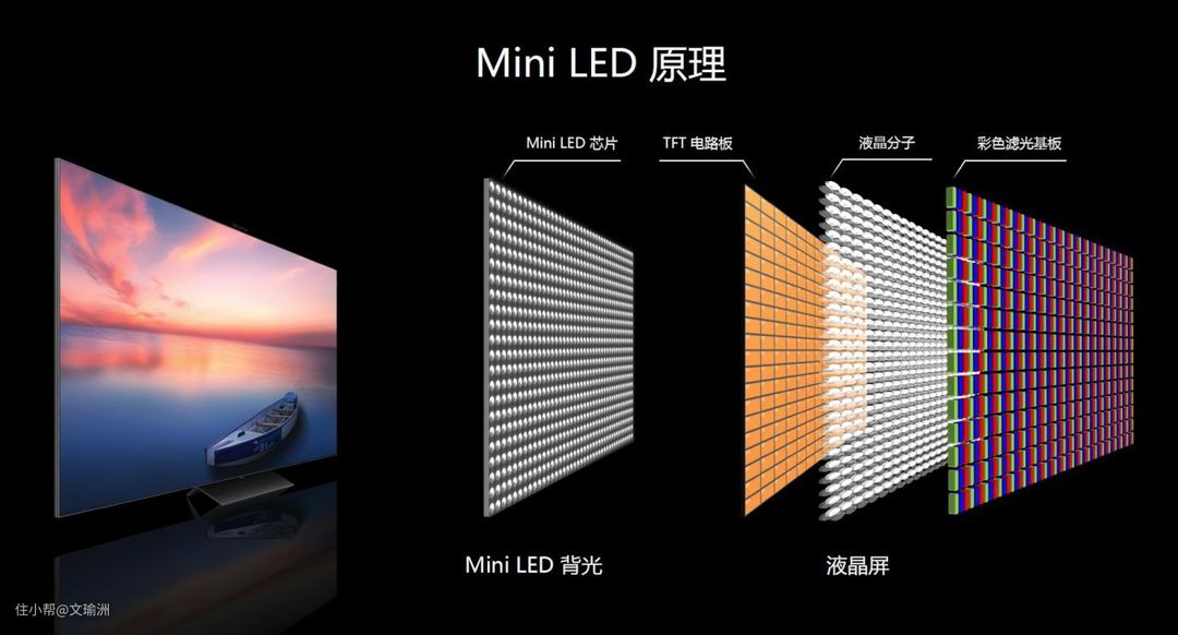 首先目前电视市场屏幕主要就是由LCD和OLED两种面板组成,而提到的Mini LED其实也是LCD衍生的一种。LCD液晶面板的色彩像素本身并不会发光,必须通过背光面板作为光源照亮整个屏幕,像素点上会有带颜色的滤光片,它是红色的,照出来光就是红色,当三种原色凑齐后,就能显示正常画面了。