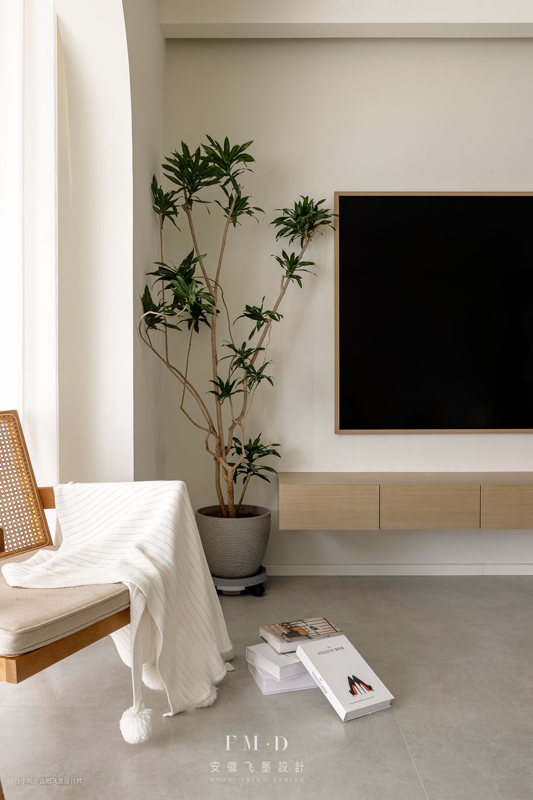 电视柜居中,左侧是散尾葵,右侧是一组实木斗柜,结合分色漆电视墙背景墙,不仅榨干了两侧空间,不对称设计也增添了一丝美感。