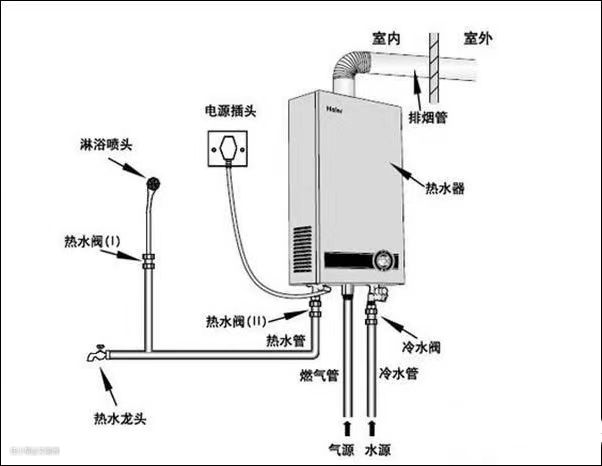 安装时,上方接排烟管,下方接热水管、燃气管和冷水管
