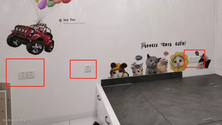 次卧插座是够了,但因为当时不确定是做榻榻米还是放床,就按床位置留了,最后布局原因还是做了榻榻米,结果墙上凭空多出6个鸡肋的插座,丑哭了。