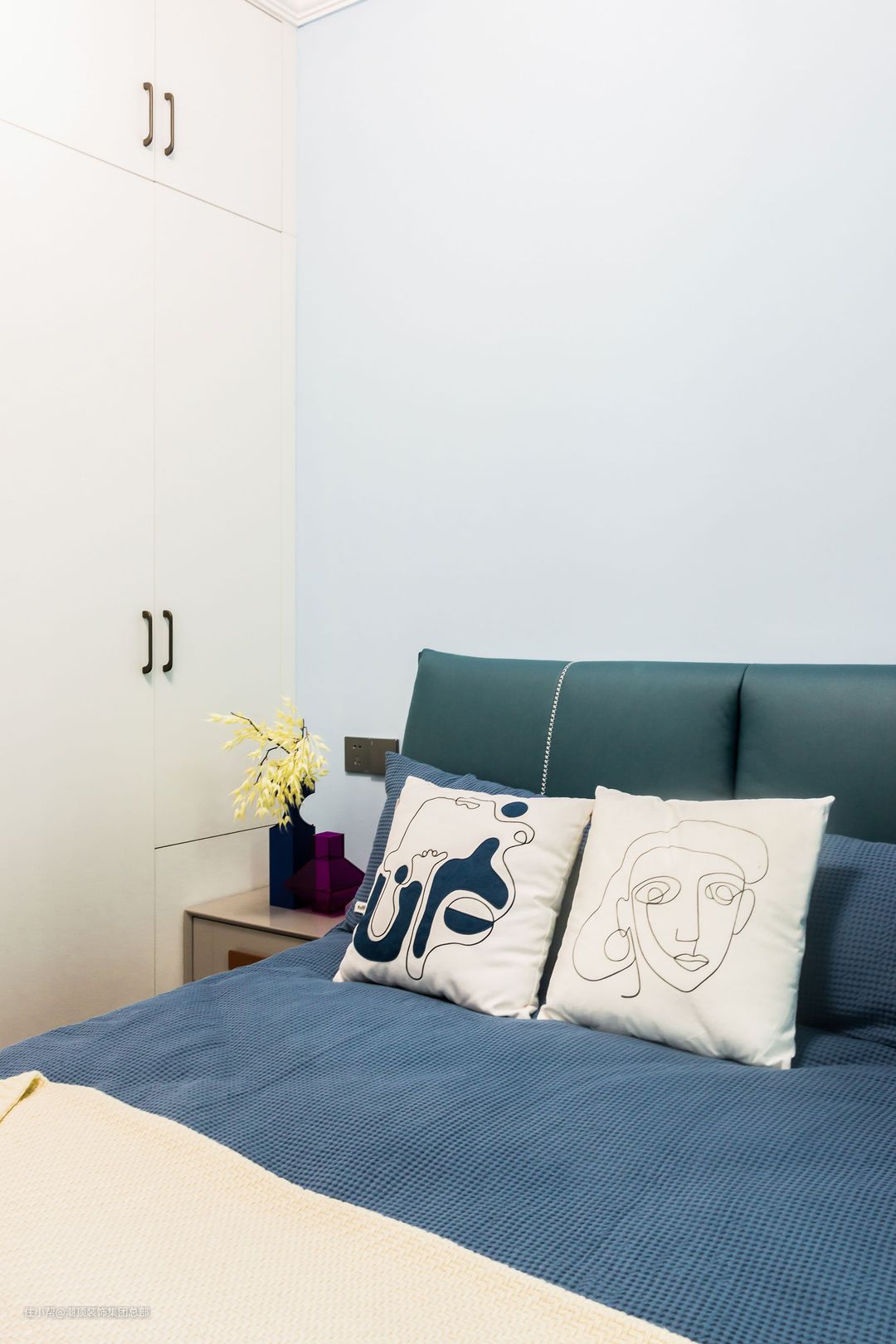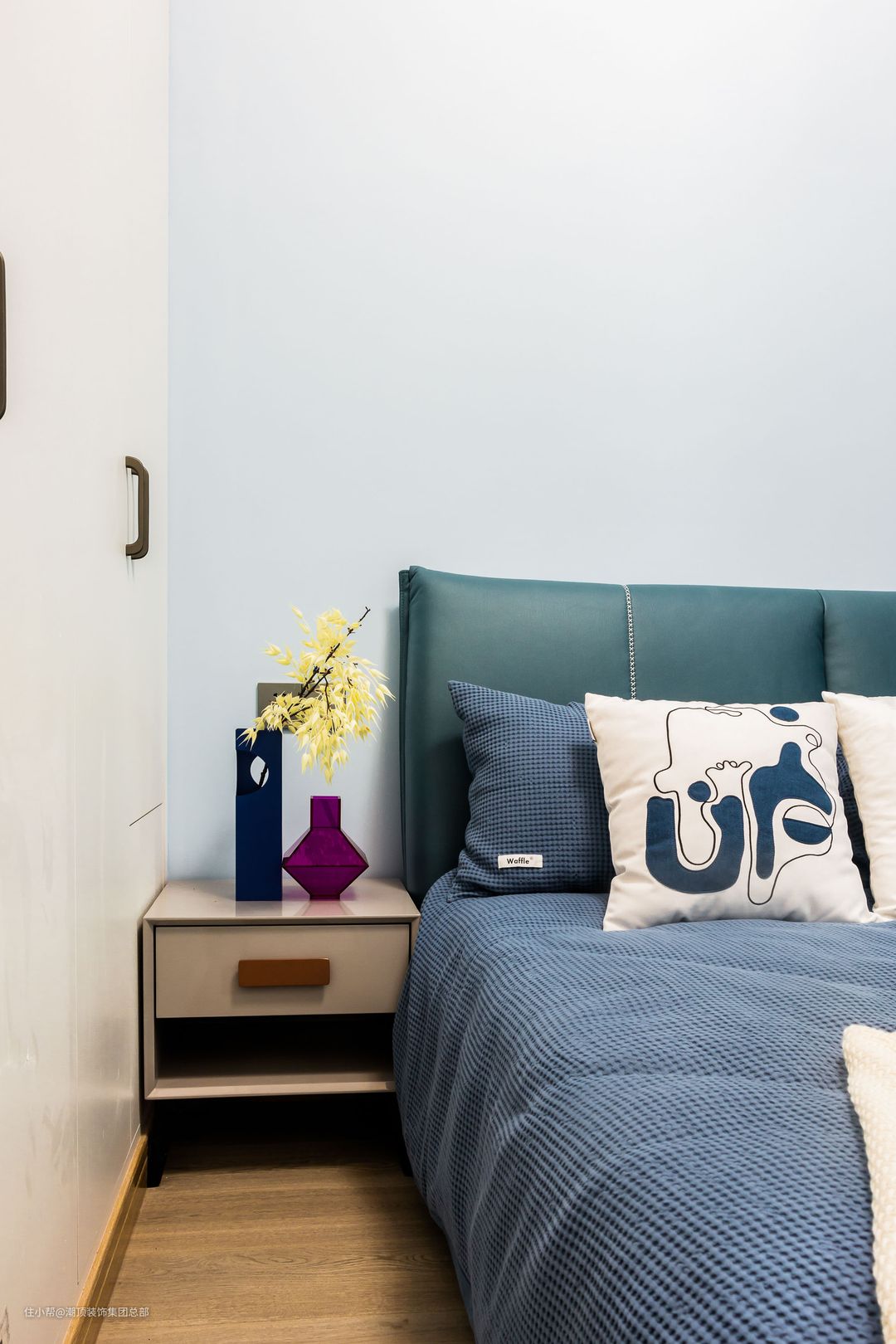 次卧的主调是蓝色,浅蓝色的乳胶漆墙面+深蓝的床品和窗帘,再点缀一个绿色的床头,营造出一种清新优雅的氛围感