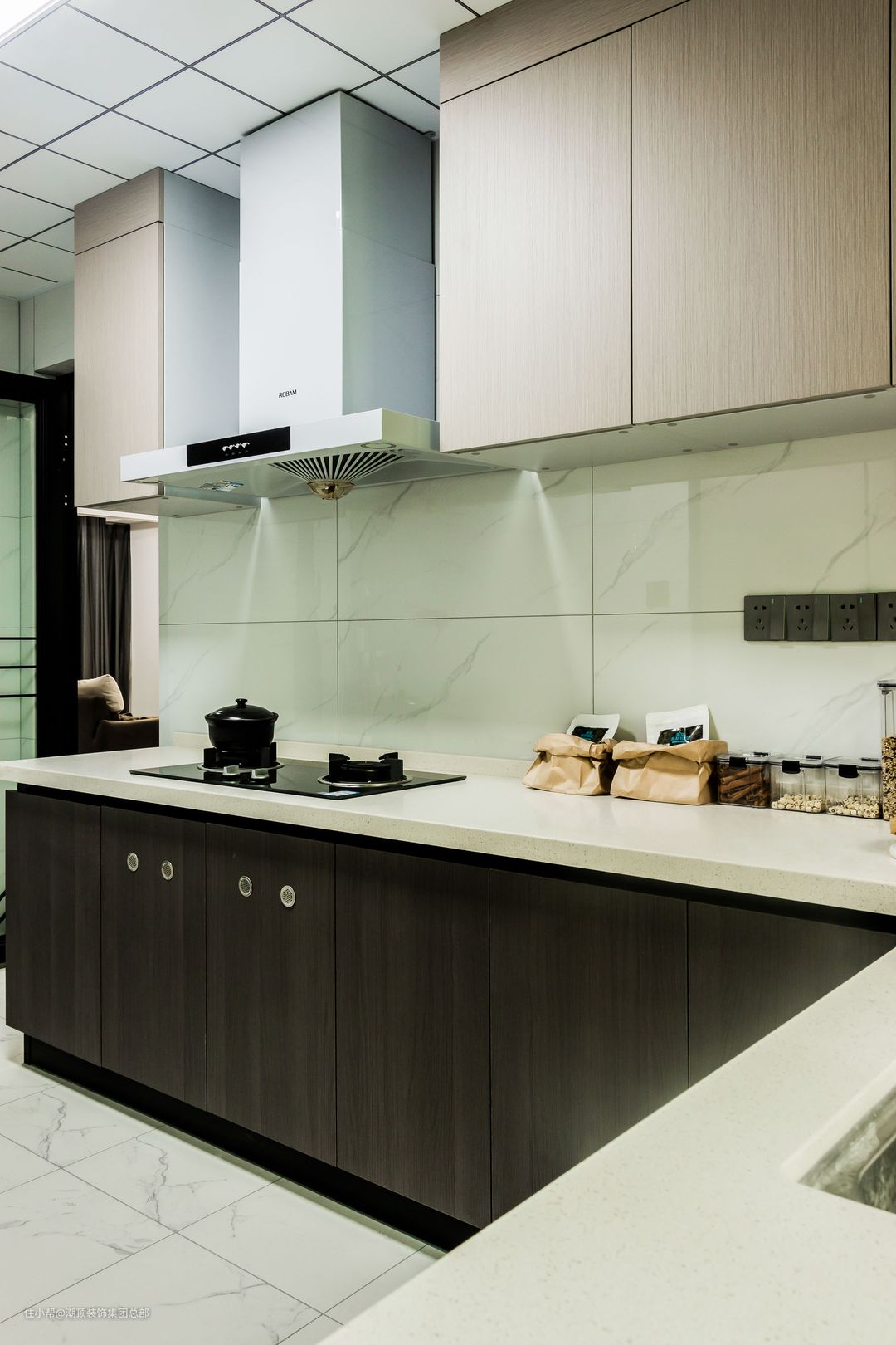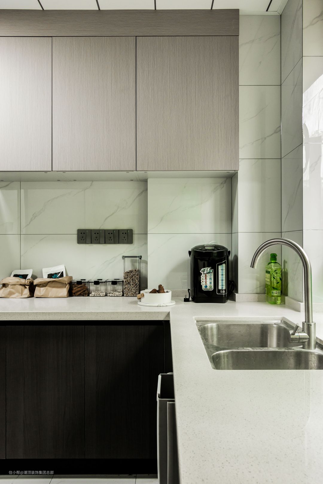厨房则是深浅色搭配的设计,白色大理石纹墙砖将上下橱柜进行过渡,加大视觉空间感,L字形的操作台为主人提供了一个方便宽松的烹饪空间。橱柜门不设把手,精致简洁,搭配白色大理石纹地砖,让厨房也可以精致优雅。