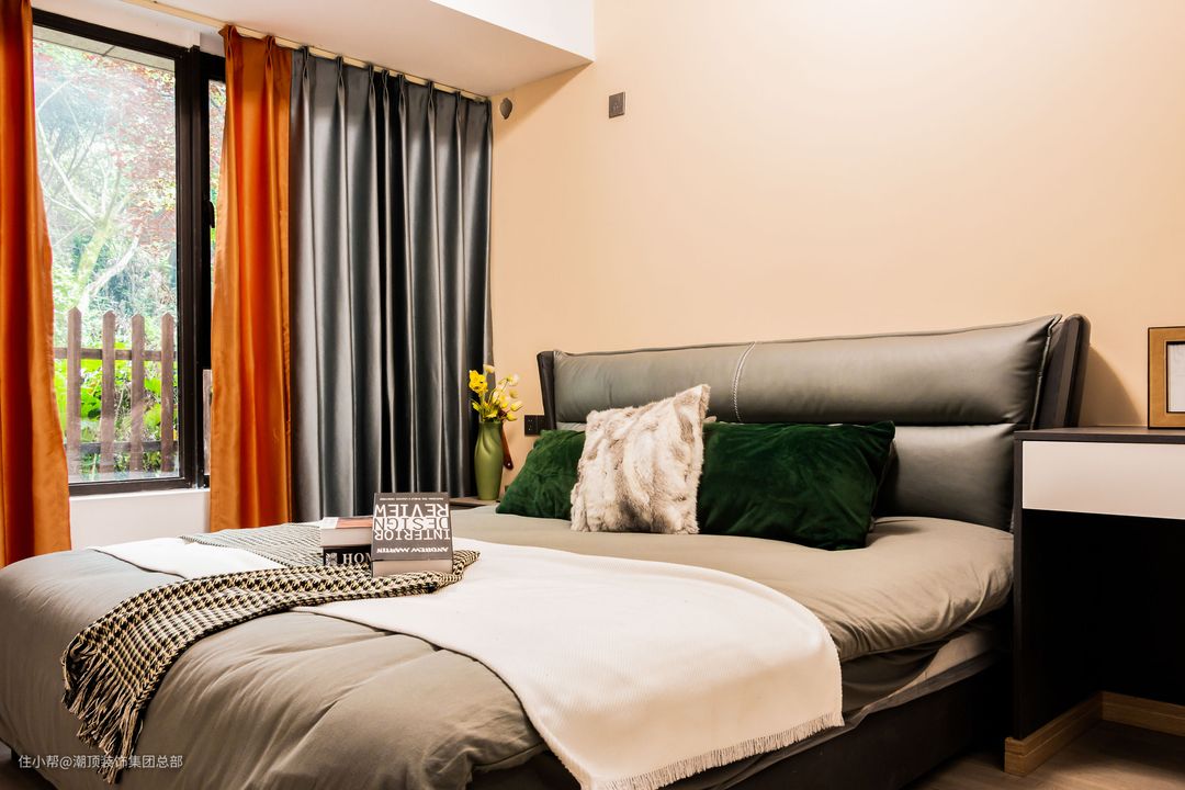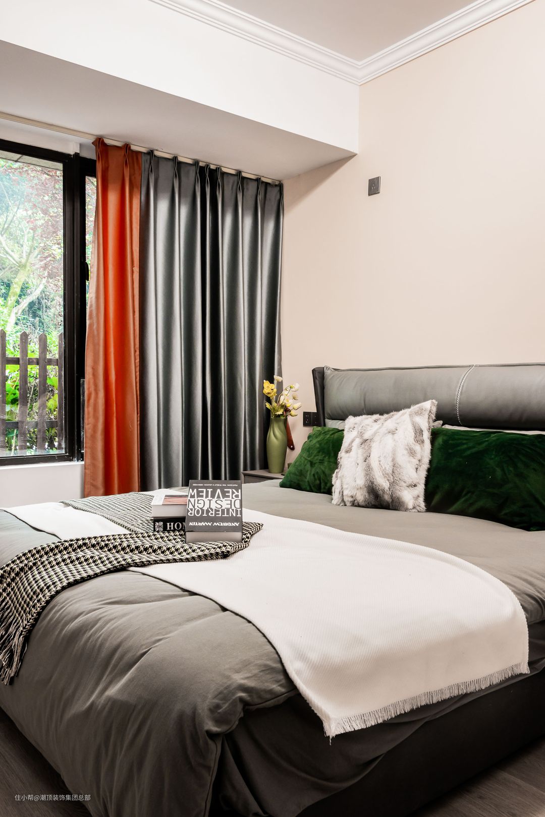 主卧的采光和通风都非常好,打开窗帘就可以欣赏窗外风景,观景效果极佳。整个空间以大面积高级灰打底,点缀爱马仕橘、玛瑙绿,为沉稳的空间里融入几分女人气味。当清晨的阳光透过玻璃窗照进来,暖意满满。