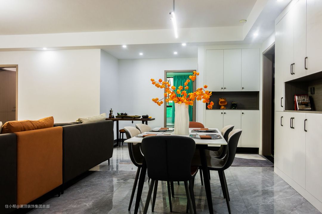 餐厅布置岩板餐桌,搭配皮质撞色餐椅,还有精致的花瓶布置,使得用餐空间端庄而雅致。