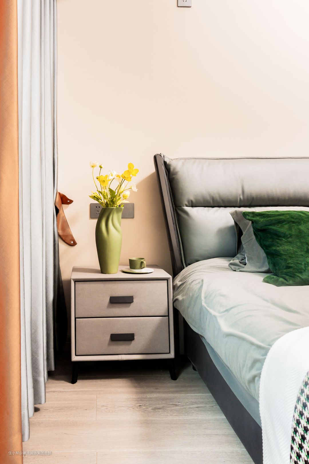 米杏色的乳胶漆墙面搭配浅色木地板真的十分和谐自然,左侧是一门到顶的浅色衣柜,把衣柜延伸出来就是一个梳妆台,下方预留插座方便实用。右侧是一个灰色床头柜,摆上一个翠绿花瓶,点缀着鲜花,带来一种清新宁静之感。