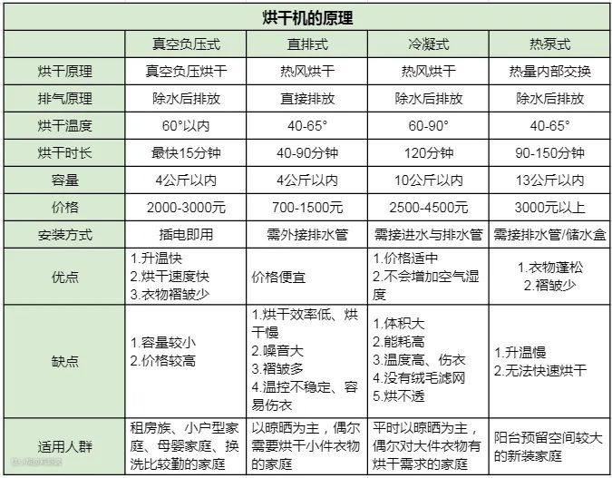 目前市场上的家用烘干机,根据核心烘干原理可分为真空负压式、直排式、冷凝式、热泵式4种,不同的烘干机在烘干原理、烘干温度、烘干速度、容量、安装方式、价格等方面都有差别,为了方便大家对比,我根据以上参数为大家准备了一张表格。