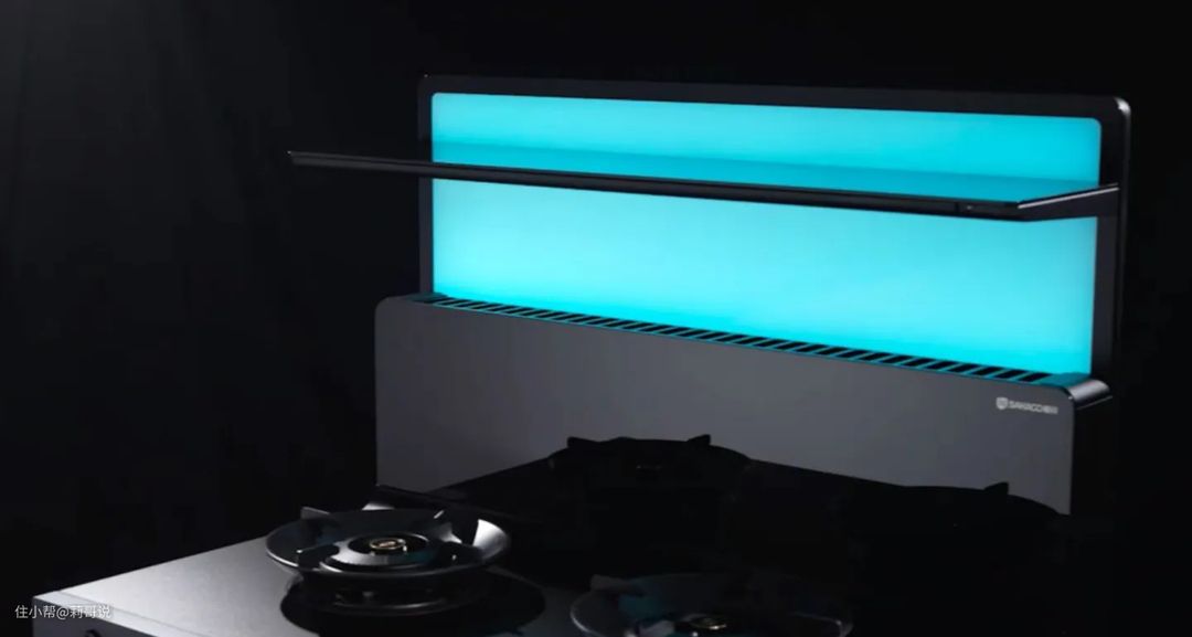 烟机头部有挥手就能变色的大面积可变光源,这个就属于个性化设计了,平时做饭比较无聊,挥手变色,还蛮有意思的。并且,整个厨房好像也显得更有活力了一些。