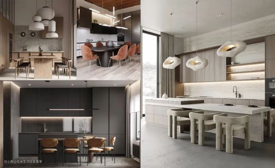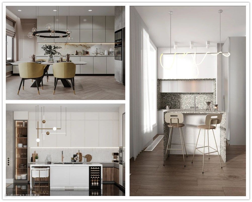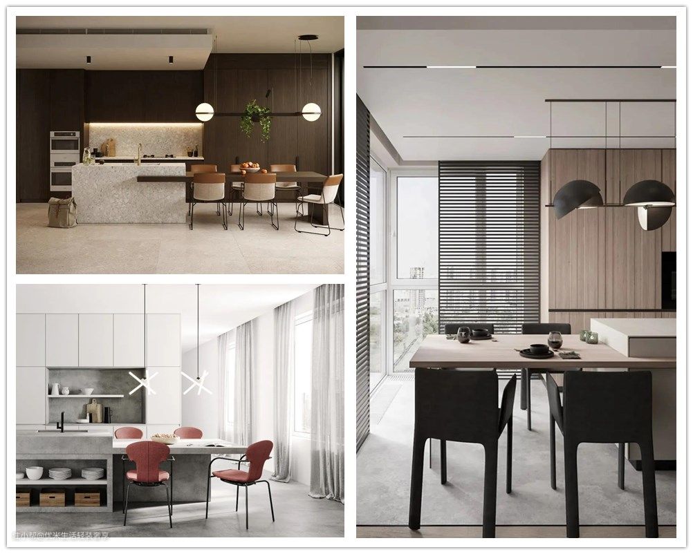 - 餐厨一体设计别忘了在餐桌上布置灯光,吊灯即可,吊灯底部距离桌面大概800mm左右比较合适,长方桌搭配线性吊灯可以适当离桌面近一些。