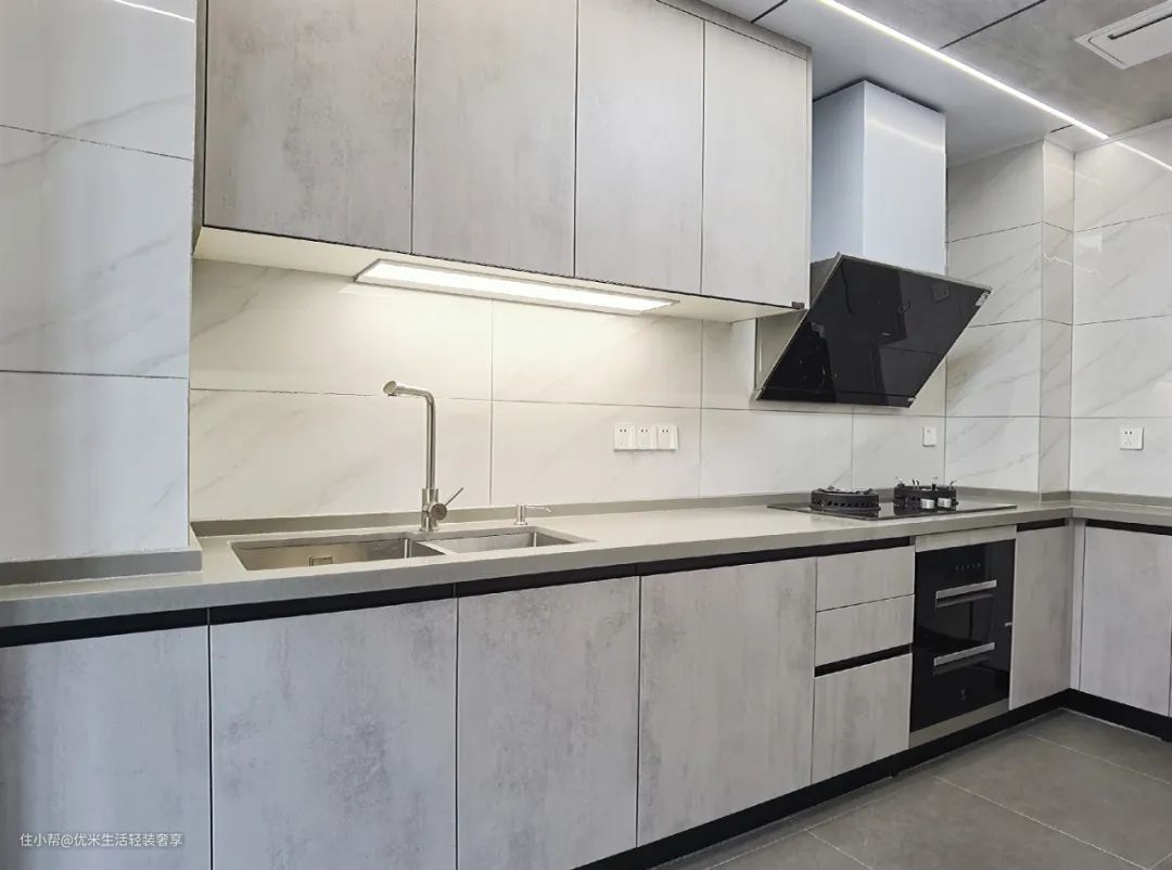 餐厨一体设计为开放式结构,如果不及时整理很容易变得凌乱,严重影响空间颜值,所以想要家里维持比较干净整洁的状态就需要你够“勤快”,以及台面上有一定的秩序感。这个可以通过使用同款的收纳器具来达到视觉上的统一,比如瓶瓶罐罐都买一样的,贴上标签使用即可,收纳空间合理利用。