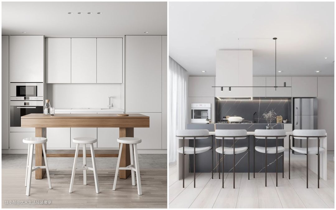 餐桌可以与岛台连接在一起,也可以购买成品餐桌拼接在一起,建议餐桌买大一点的,用起来更舒适。
