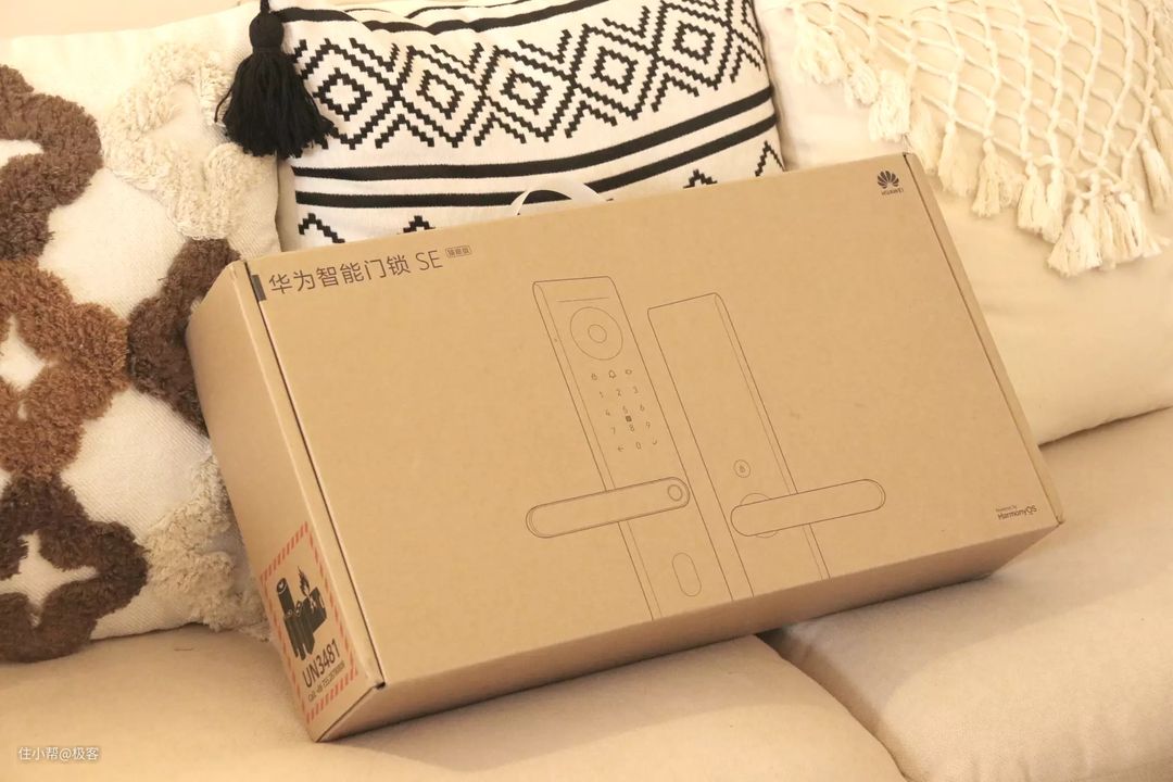 华为的品质自然没得说,这款门锁带有智能猫眼,售价也在千元出头,性价比很高。我们先看下它的包装盒,采用的是牛皮纸盒包装,封面有简单的线条图,大致能看出这款门锁的轮廓。