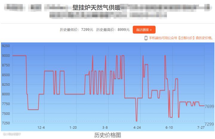 我可是有依据的,这是在某比价网搜索的某著名品牌壁挂炉的历史价格走势,可以看出最冷的时候,壁挂炉的售价都高达9000元,但是最近的售价一直在7000多元上下徘徊: