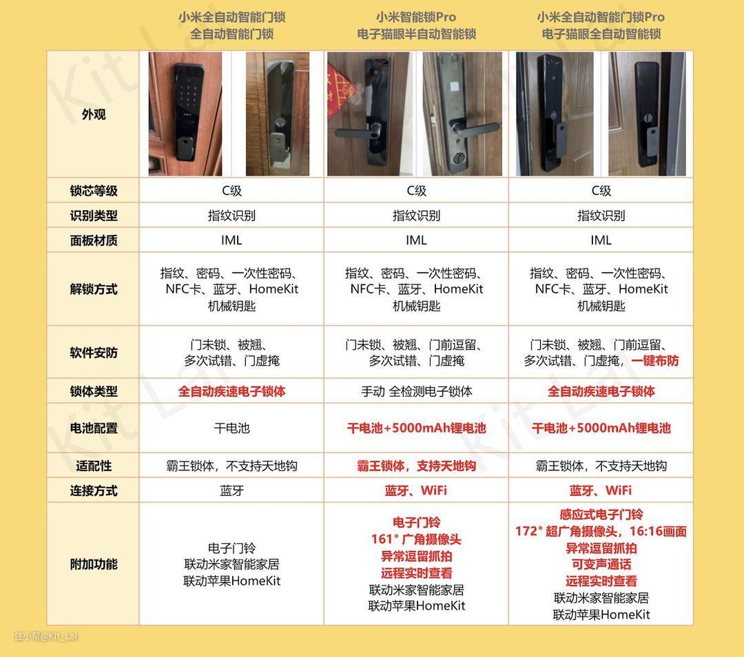 三款因为都是小米的智能锁,所以相同的地方就不做对比了,我们主要还是对比标红字的部分。