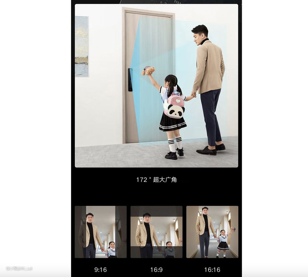 - 「小米Pro」拥有161°的广角镜头,其实对于门前情况基本已经可以尽收眼底,「全自动Pro」在原来足够视觉宽度的基础上增加了将可视角度提升到172°和把画面比例提升到视觉更全面的16:16正方形。