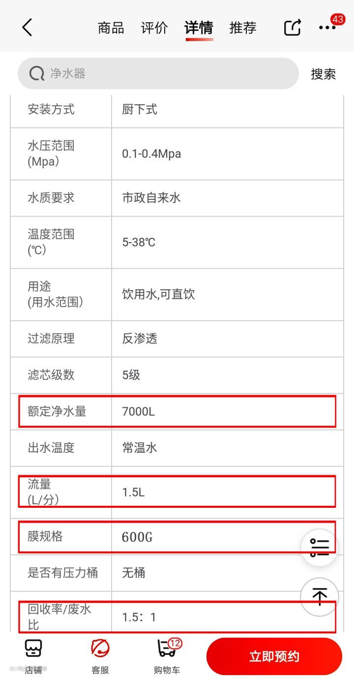· 进一步缩小范围,看流速(膜规格),额定量(滤芯耐用性)等一些重要性能参数。