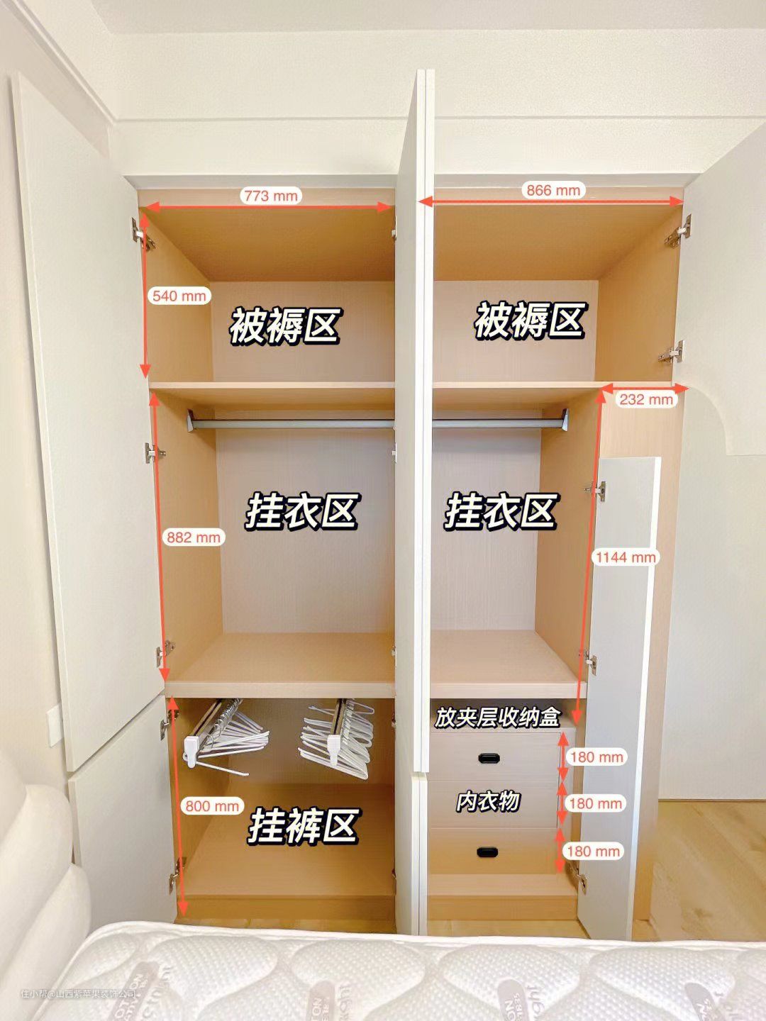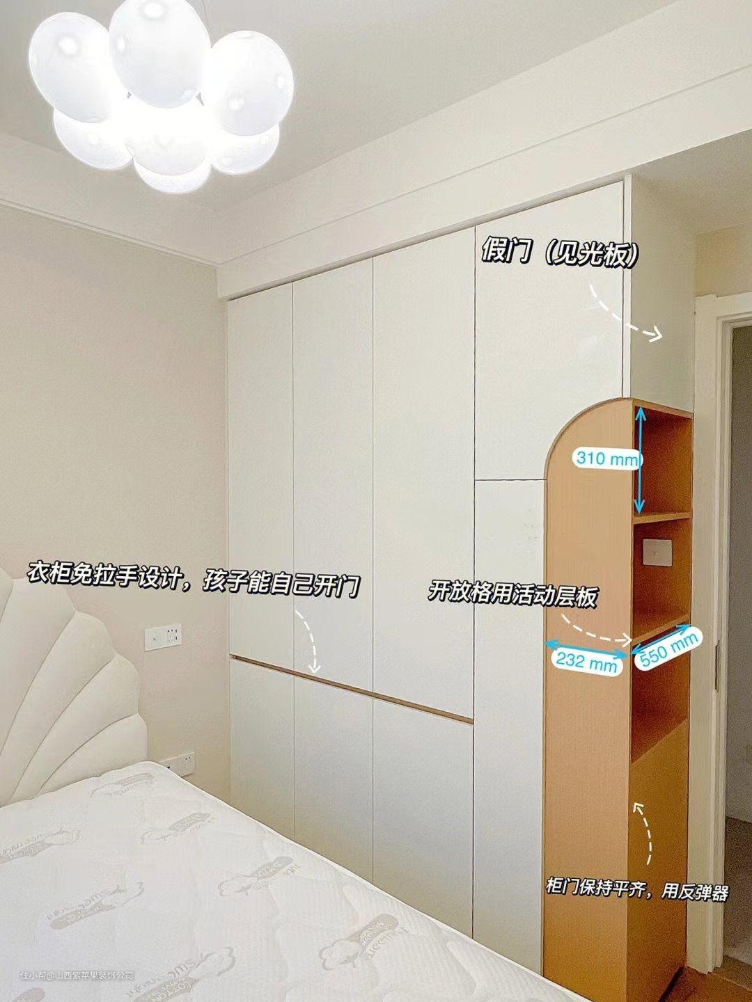 衣柜考虑孩子身高问题做成了分割式衣柜,方便其自行拿取衣物,同时分割式衣柜区域独立,开门灵活,可以更好的利用空间,储物功能也更多样化。