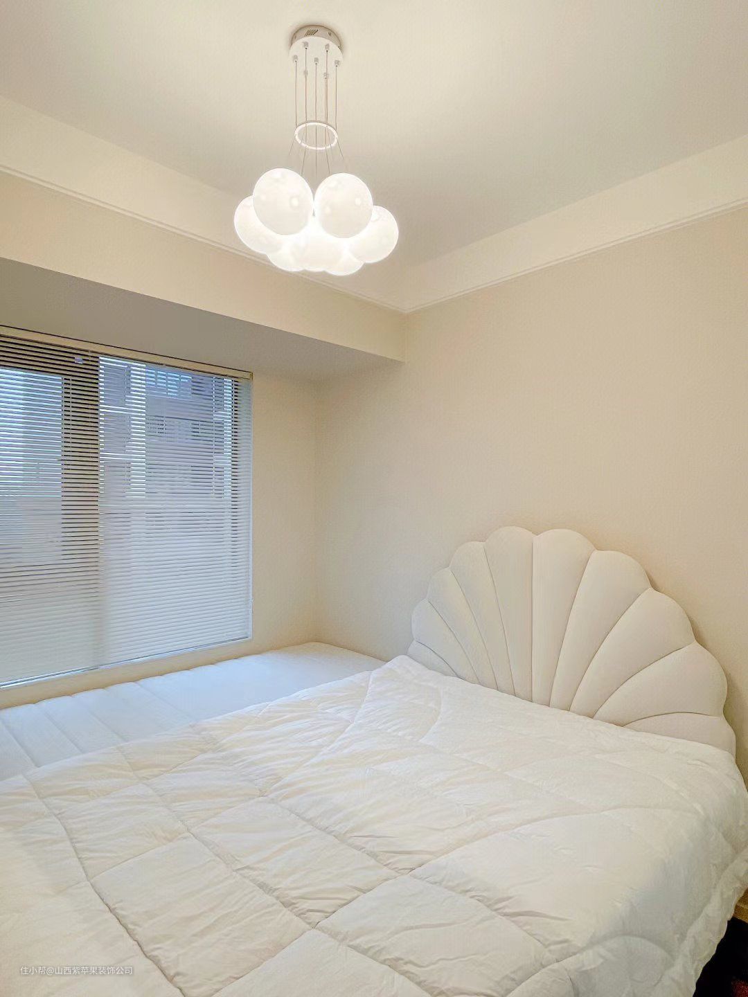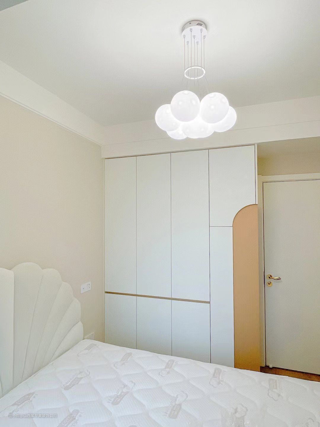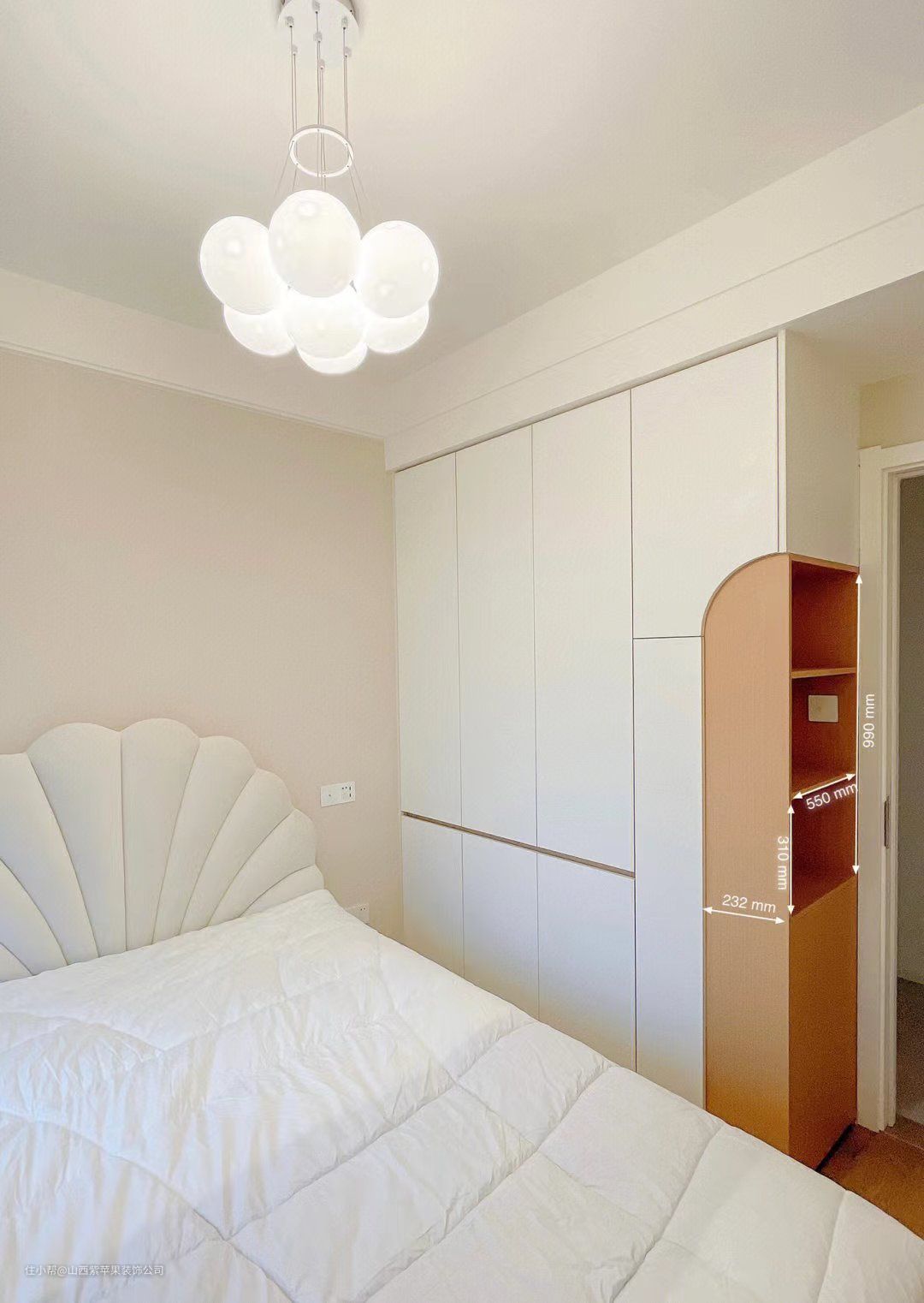儿童房空间色调以奶白色为主,明亮舒适,也更适合长期的风格。衣柜选择木纹和白色搭配,简洁又温馨。