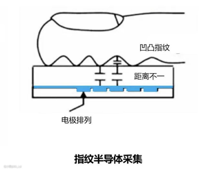通过一块高度集成半导体元器件的“平板”上,手指指纹贴在其上与其构成了电容(电感)的另一面,由于指纹平面凹凸不平,凹点处和凸点处接触平板的实际距离大小就不一样,从而形成的电容/电感数值也就不一致,设备根据这个原理将采集到的不同的数值汇总,完成了指纹的特征采集,然后识别开锁。
