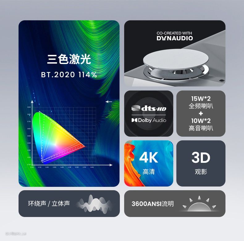 坚果的这款激光电视,也是采用全色激光光源,亮度方面达到3600ANSI,所以白天观看会更清晰;0.47英寸DMD芯片,所以分辨率也是抖动4k;颜色方面通过BT.2020 114%超广色域认证;自带的也是大牌音响品牌丹拿;唯一的小缺点就是自带的系统以优酷资源为主,相比于峰米t1会略少一点。