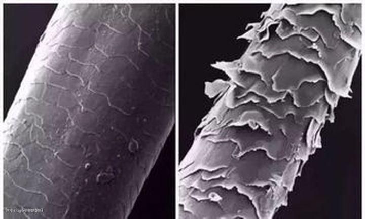 上图是我们头发的毛鳞片,左边是正常状态,右边是高温后受伤害状态。