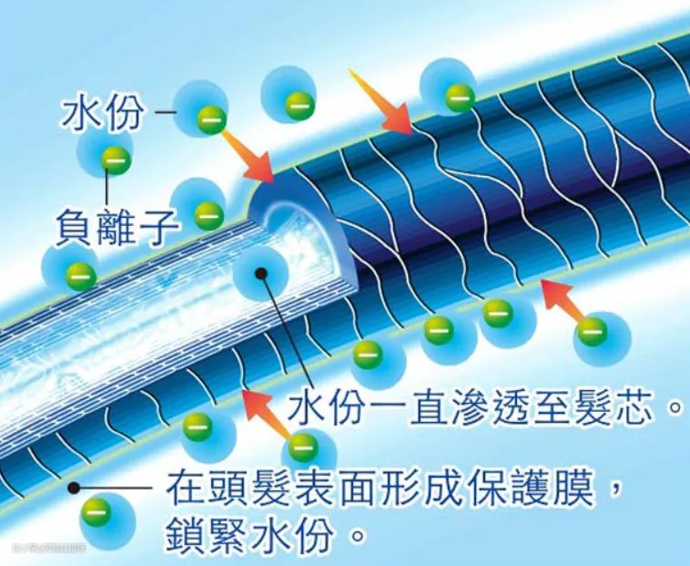 在高压电流作用下,水离子发生器能让空气中水分产生水离子,作用是吹干头发后更柔顺有光泽。