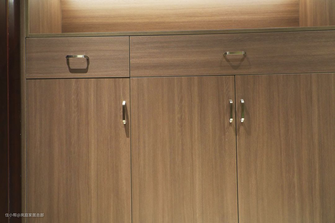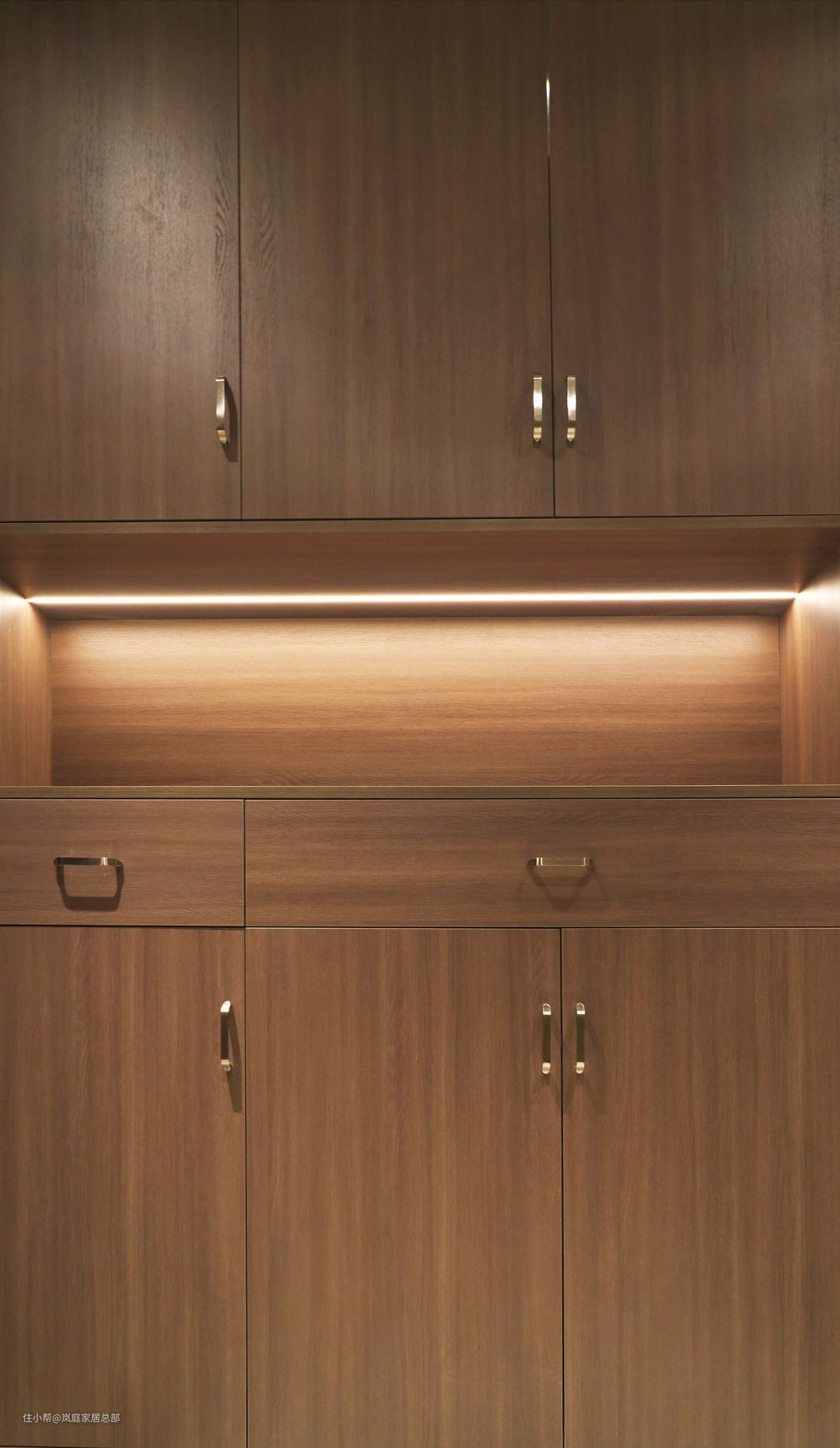金属拉手方便平时拿取鞋子,经久耐用,在使用舒适度也能上一个台阶。 在整个鞋柜的设计上,其实没有用太多的新奇元素,金属质感的把手设计,简约而不简单,将业主需要的品质这一点做得恰到好处,沉稳大气,既能彰显轻奢风的优雅高级也能在视觉上回归简单。