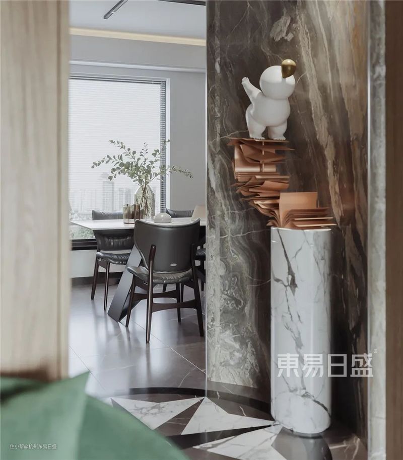 ◆入口玄关处的地面用砖体的色彩进行了立体感的铺贴,趣味十足的艺术品摆放,使整体显得高级又有颜值。墙面大理石与支柱花纹相呼应,在其中通过艺术品点缀,带来跃动而富有生命力的视觉焦点,展现出现代时尚感。