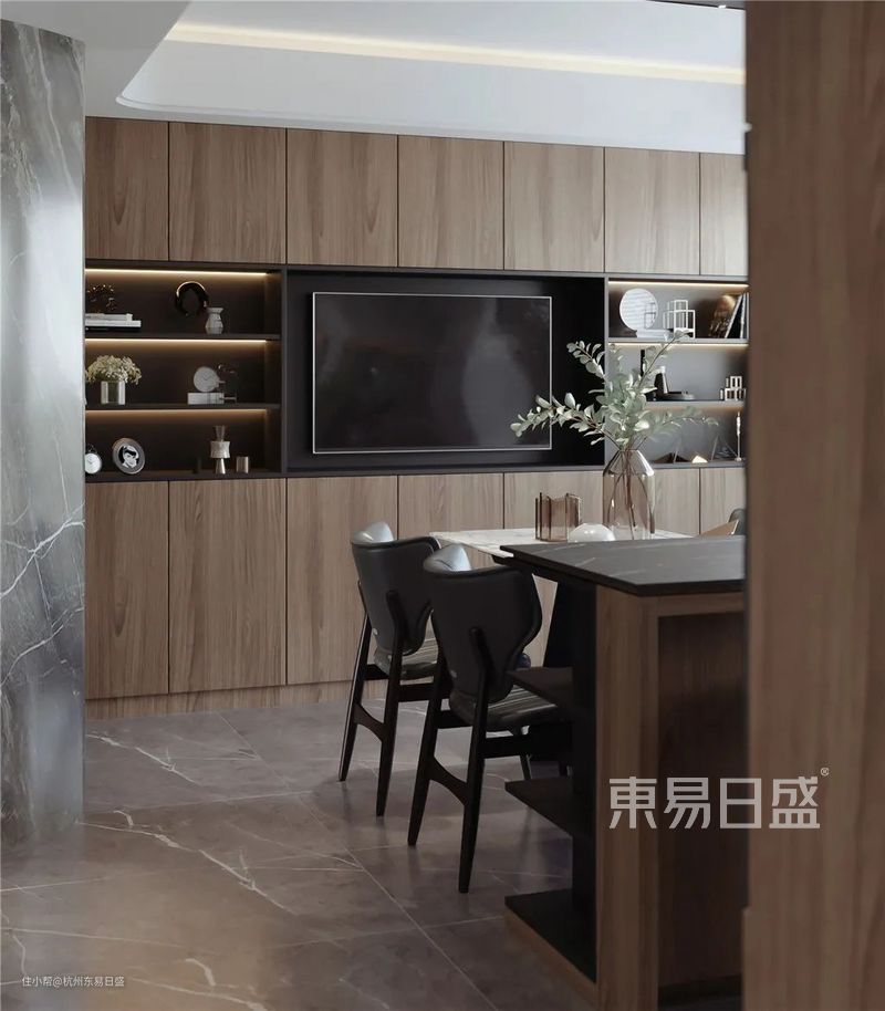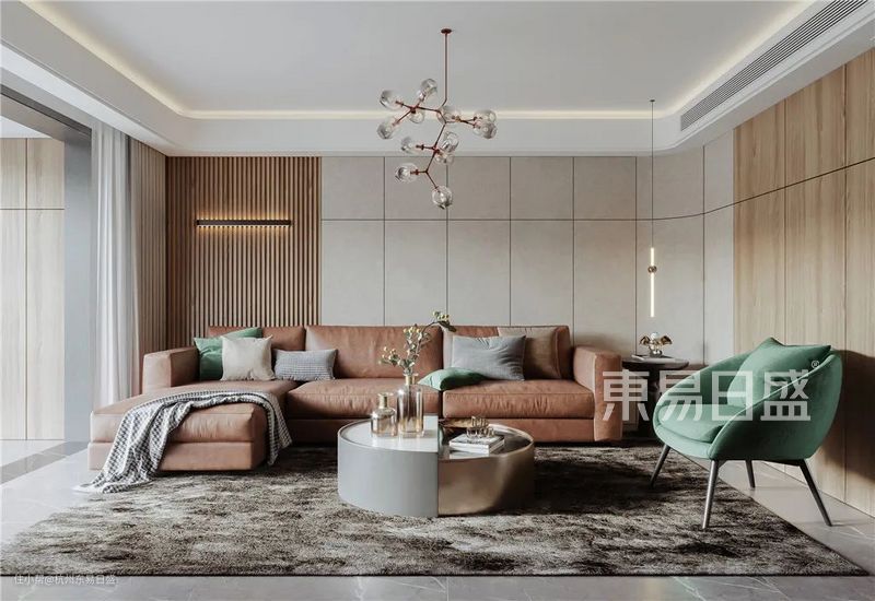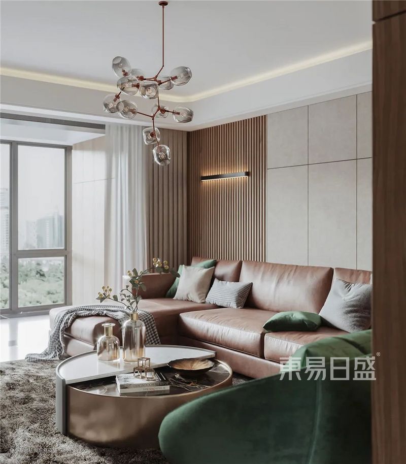 ◆客厅以深色为主色调,融入简洁、明朗的墨绿色彩,调和出一种大气优雅的空间氛围。咖色的皮质沙发,拥有宽阔的坐卧感,搭配其中显得高贵十足,岩板+金属材质组合的茶几,突出简约现代的品质感。脚下的毛绒地毯带来最柔软的触感,让人感受到一种贴近大地自然的舒服。