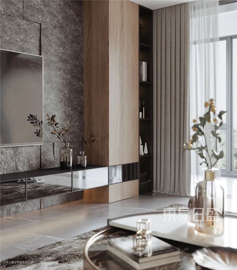 ◆灰色石材电视背景墙,搭配原木色橱柜,色调温和而优雅。客厅整体橱柜的设计,摒除多余的陈设,只保留简单利落的线条构架,极具现代感。