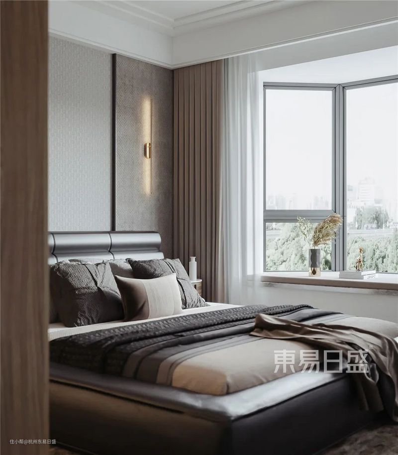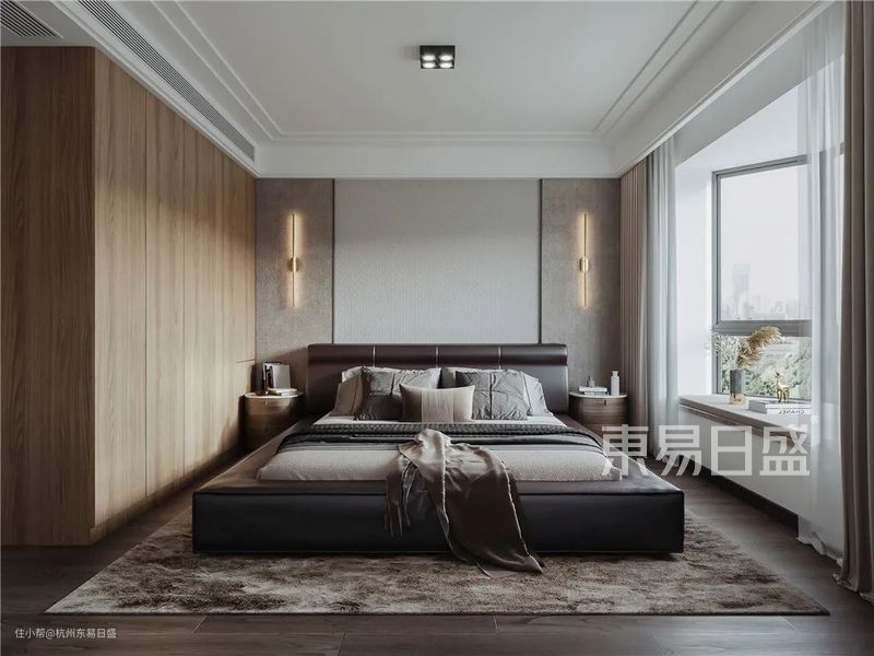 ◆深咖色的双人床,轻盈的纱帘,配合柔和的壁灯,营造舒适温馨的起居氛围。