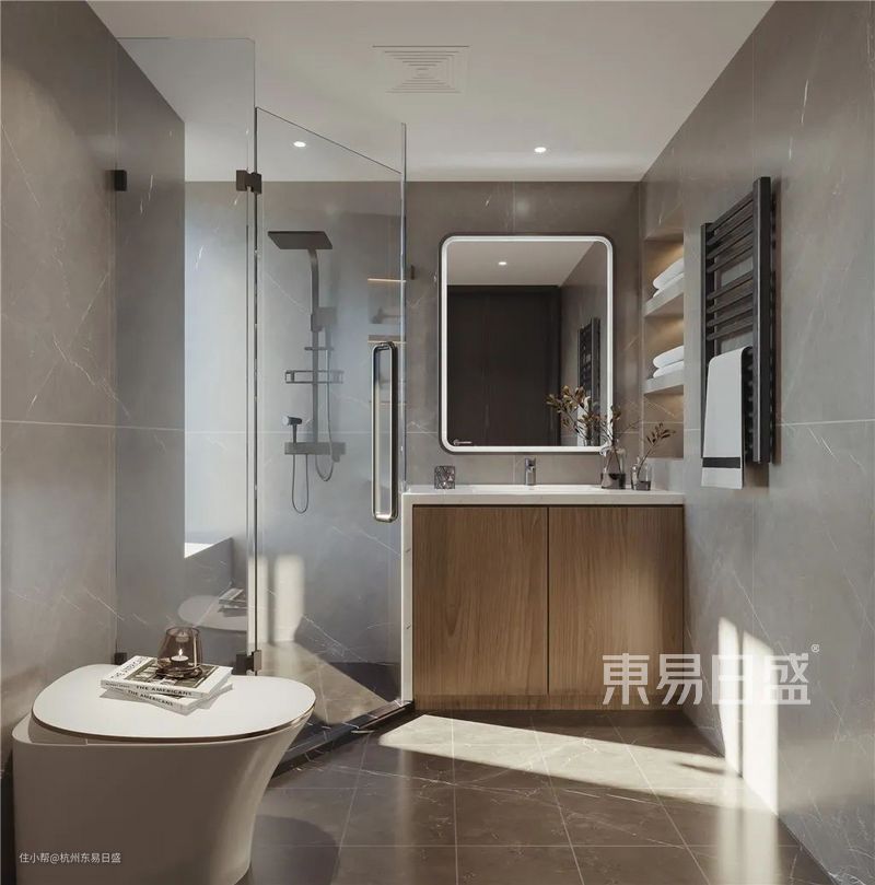 ◆卫生间通铺灰色哑光瓷砖,简单的色调和合理的布局,让原本狭窄的空间变得更加宽敞。用玻璃隔断做干湿分离,区分功能区域同时保证光线的透亮。