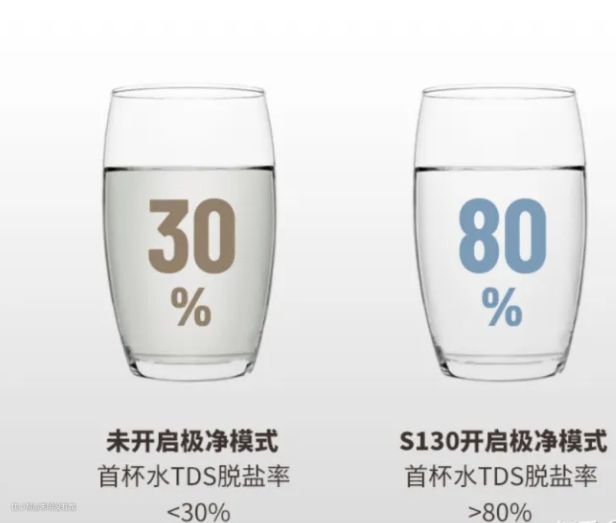 S130采用了刚才提到的零存水技术。关机后会再工作一小段时间,使用纯水冲洗RO膜,,使RO膜前后都是纯水。这样一来杜绝了关机后的渗透问题,大大降低了清晨第一杯水的杂质含量。随时开机,都不用担心水质问题。