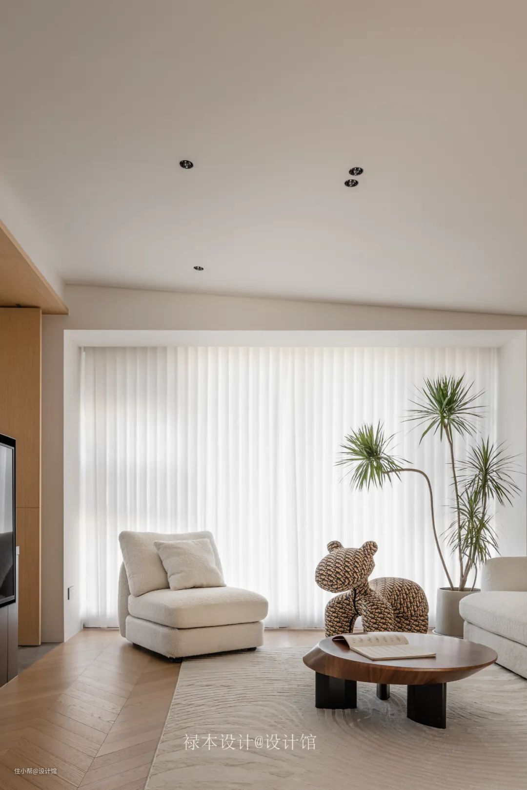 ▲沙发墙以木饰面墙面+矮墙+圆形木色柱子的设计,布置米灰色的布艺沙发,角落还有绿植的装饰点缀,让空间充满清新自然的文艺与舒适感。