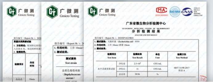 再来看看它的检测报告,显示确实是能去除大部分的农残细菌的,最高能做到99%
