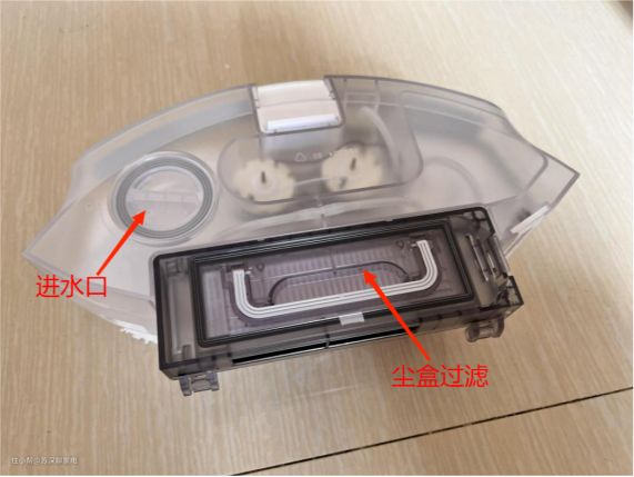 它的水箱和尘盒是一体式设计,整体比较方便拿取。仔细观察,能够发现它的加水口是比较大的 ,并且以内X3有随着机器附带一个清洁液,平时在做地面清洁的时候也可以把清洁液倒进加水口,这样随着拖布的行进就能够实现地面清洁除菌了。而且在尘盒的位置也有对应的过滤措施。