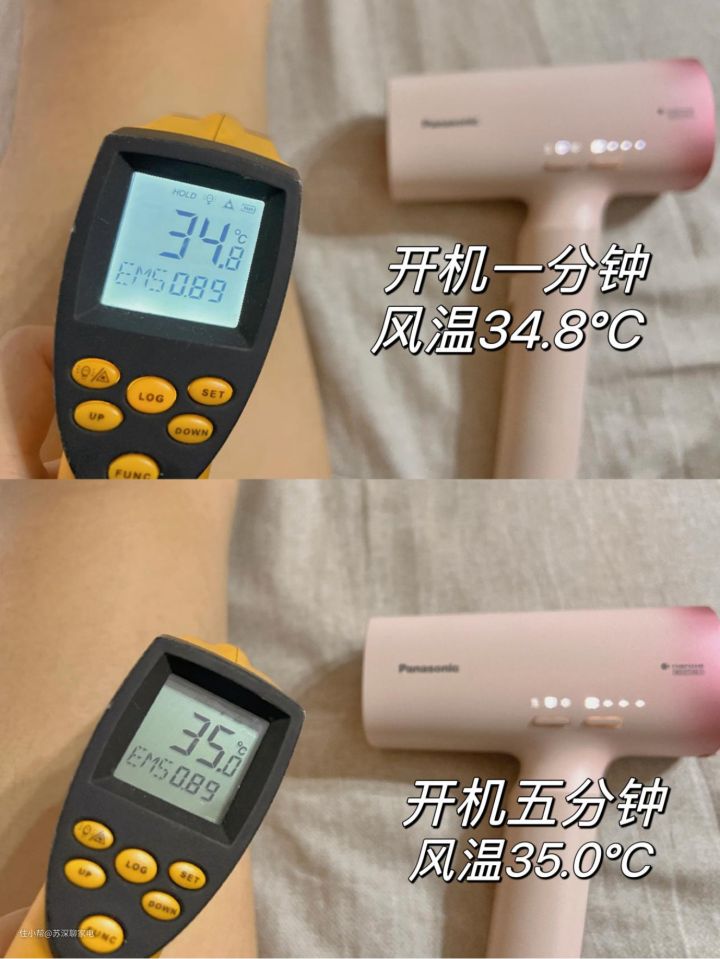 先测评的是松下吹护机。开机一分钟时,皮肤表面温度为34.8℃。开机五分钟时,皮肤表面温度为35℃。前后温差0.2℃,恒温功能不错。