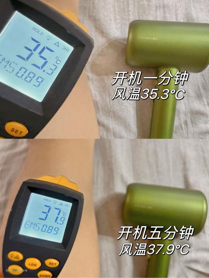 测试方法为用吹风机在靠近皮肤的位置连续吹热风五分钟,测量1分钟和5分钟时皮肤的温度变化,用以判断吹风机的风温是否有随着工作时间增长而上升。