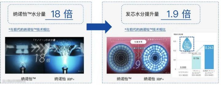很明显的可以看出,纳诺怡的补水能力远远超于普通负离子。而我这次吃瓜购买的松下吹护机实际搭载的是纳诺怡润护+技术,作为初代纳诺怡的升级版,纳诺怡润护+的含水量提升18倍!一次吹护发芯水润度能够提升1.9倍。