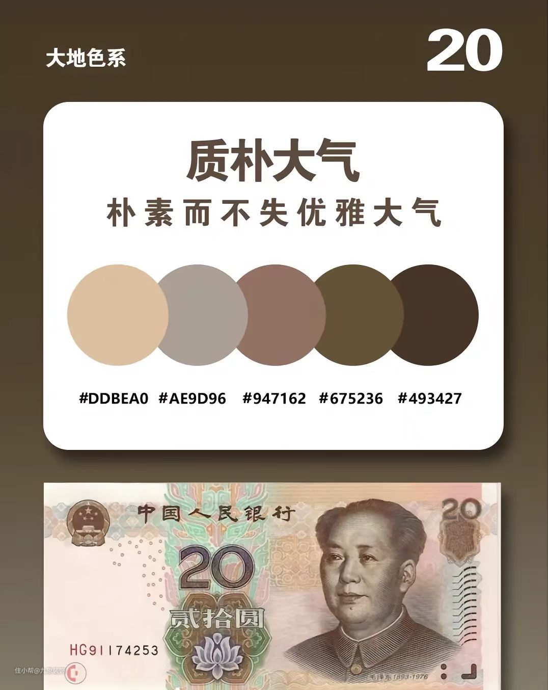 二十元人民币的配色是色调中的王者,棕色系可以说是大部分都很喜欢的装修配色,它可以简约、可以时尚、可以复古,可以说是百搭色系了,如果我们还在为装修配色烦恼不妨试试看百搭的棕色系配色,肯定会给我们眼前一亮的效果的。