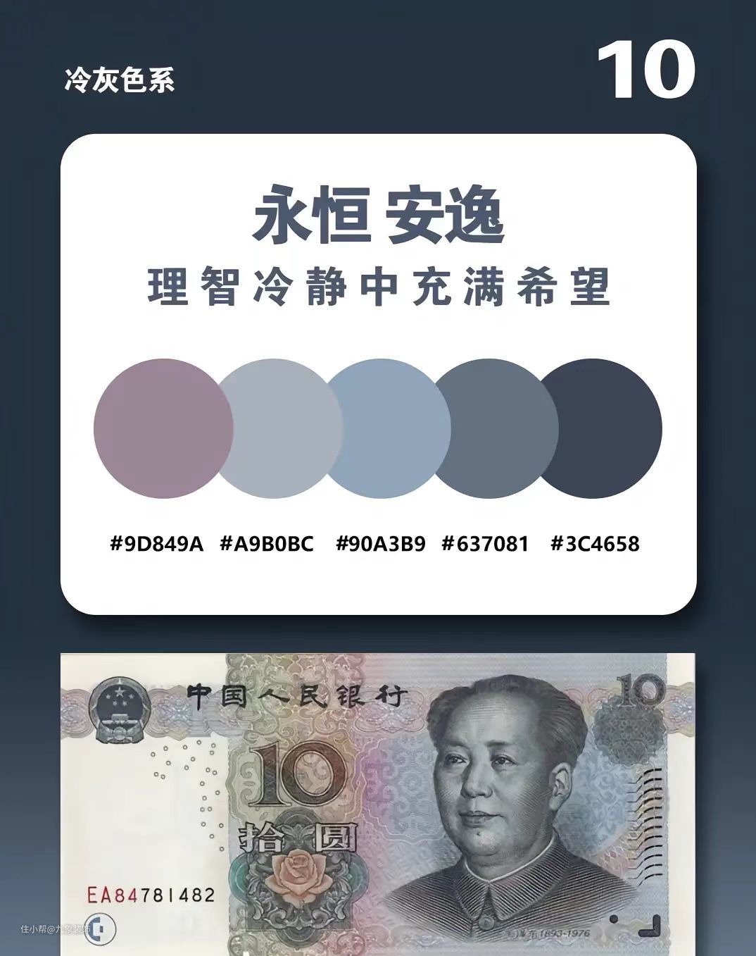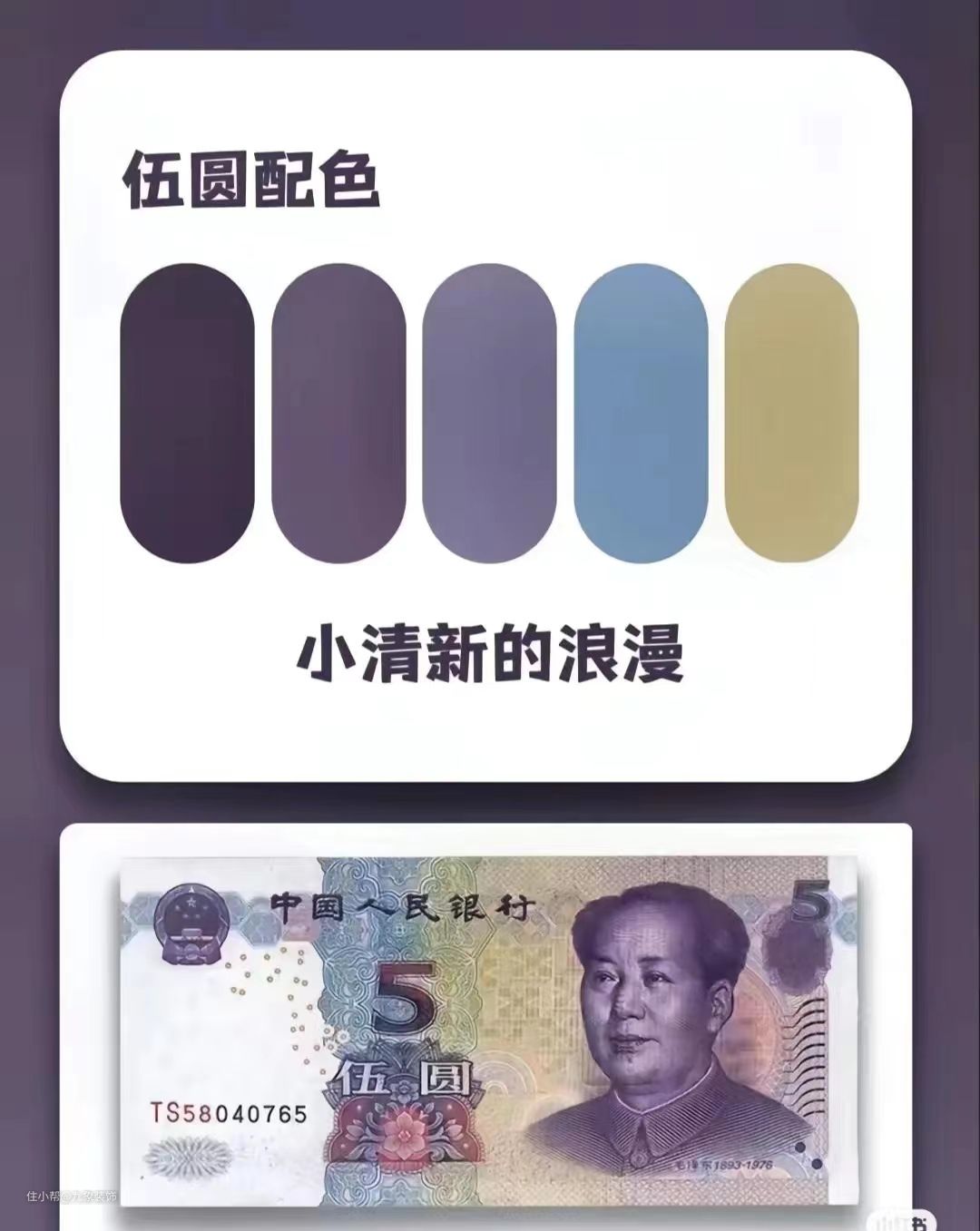 五元人民币的配色则是高贵典雅的紫色系,那么这种色系就是女生们心心念念的高贵配色嘛,把它运用到我们的家装中,既浪漫又贵气但却不失优雅,而紫色也代表了永恒,这肯定戳中某个少女的内心。