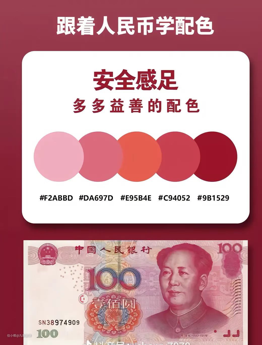 最后就是一百元人民币,它的配色可谓是大部分少女最爱的红色系在掺杂着玫粉色,我们把家也装成满满少女心的色系。而且众所周知,时尚圈也对红色和玫粉色也情有独钟,如果我们将如此大胆的配色搬进自己的小家中也是非常震撼的。