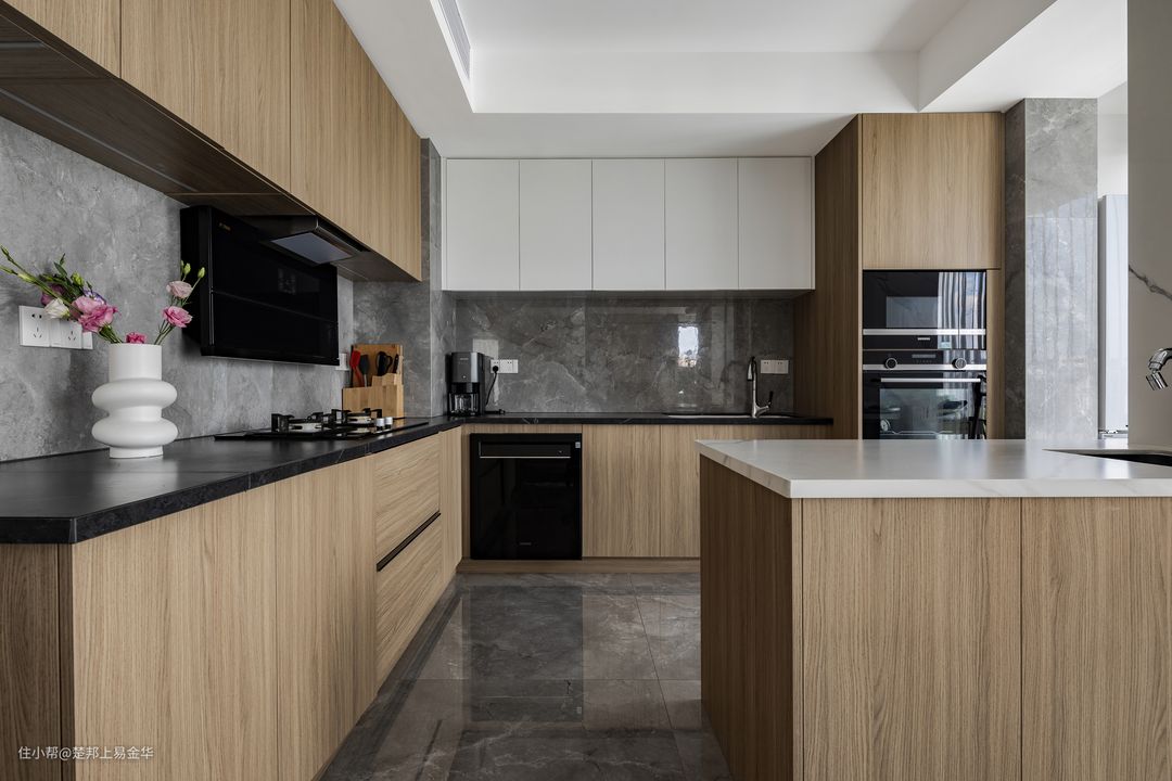 厨房整体色调以原木色厨柜为主,搭配深灰色地砖,点缀一些白色,更加有烟火气息。黑色的大理石台面更加耐脏,