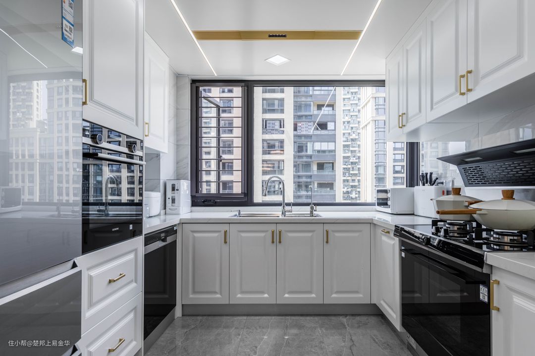 厨房和客餐厅隔开,整体以大量的白色为主,还有超大的窗户,厨房通透明亮,也不会潮湿发霉。