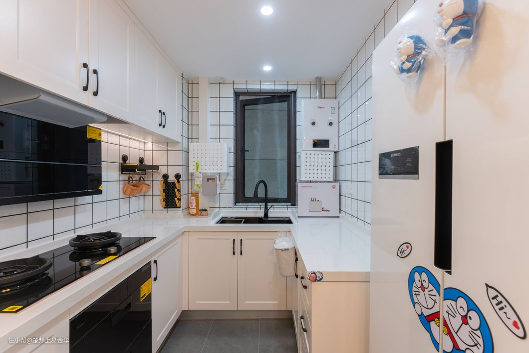 厨房白色柜面与黑色电器配色简约、搭配白色小方砖,纯净的配色、是女主人想要的小清新风格。